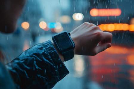 Commuter checking a weather app on a smartwatch while waiting in the rain, surrounded by the vibrant lights of the urban evening