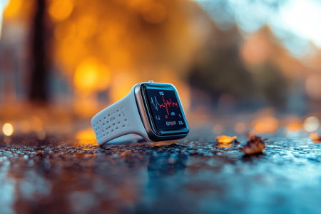 A sleek smartwatch shows heart rate data on a wet surface amid fallen autumn leaves under warm lighting.