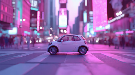 A futuristic smart car is surrounded by glowing data lines, showcasing the blend of technology and innovation in transportation. The design highlights connectivity and energy efficiency in a modern urban environment.