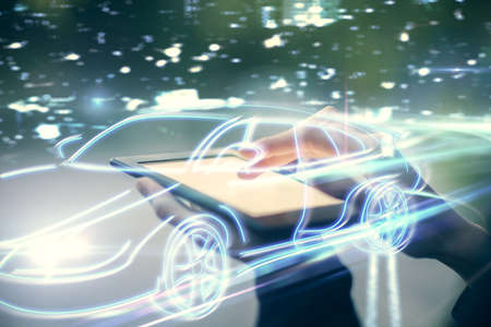 Double exposure of automobile icon hologram and woman holding and using a mobile device. Technology concept.