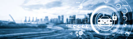 Choosing an electric vehicle. electric car choice. pointing at symbol on charging machine. electric car production Virtual Technology AR Augmented Reality or VR Virtual Reality metaverse