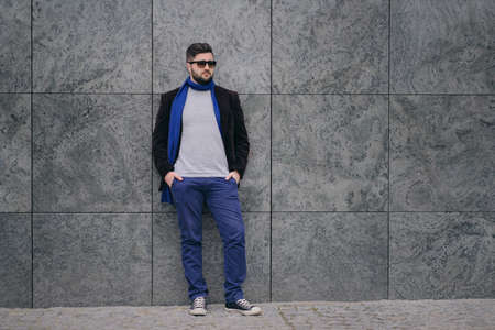 Portrait of a handsome young man in a blue coat. Studio shot.