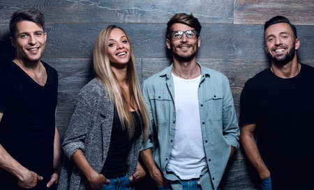 Close up view. Youth stands against black wooden wall. Group of friends spending time together.