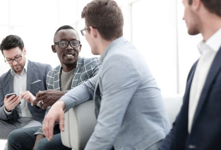 Happy diverse young multiethnic men and women sharing social media news using mobile gadgets, selective focus. Group of positive business people talking sitting in chairs in office lobby by window.