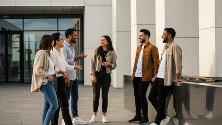A group of individuals interacts in an outdoor setting, likely a business or office environment. The scene showcases a modern architectural backdrop with a mix of neutral tones and natural light. The people are engaged in animated conversation. This image could be suitable for articles related to teamwork and collaboration.