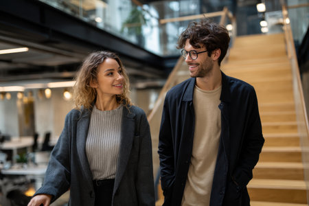 Colleagues chatting and smiling while walking up the stairs in a modern office space during a bright afternoon