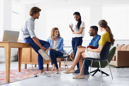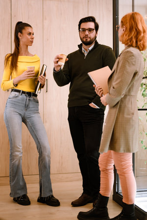 Busy coworkers talk over coffee in a modern office setting during a casual workday in the afternoon while discussing their projects and ideas together