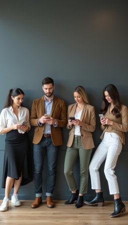 A diverse group of four professionals, two men and two women, stand against a sleek gray wall, each focused on their smartphones. Their stylish outfits and relaxed demeanor convey a modern, collaborative atmosphere, highlighting the blend of technology and teamwork in todays workplace.