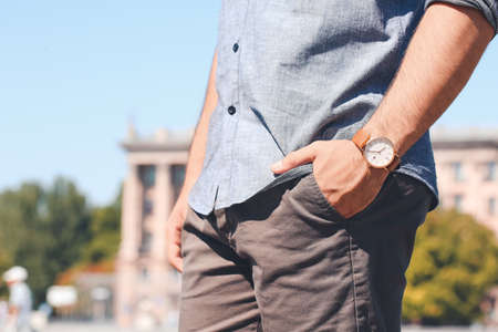 Cropped shot of the legs of young unrecognizable stylish people in smart casual clothes people who are standing in a row. Variety of stylish young people stand in bright spacious room with sunlight.