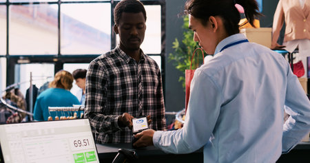 African american client putting phone on pos terminal paying for trendy clothes in boutique after discussing items fabric with worker. Man standing at retail store counter buying stylish merchandise