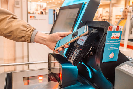 Krakow, Poland - April 26, 2022: Woman paying bill through smartphone using NFC technology in shop hypermarket. E-money payment concept