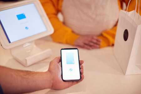 A close-up hand of a male customer who is holding a cellphone while paying through a digital wallet using NFC for his purchases in a store. Transaction at a contactless-capable point-of-sale terminal