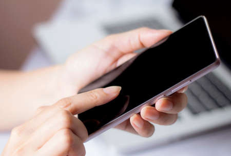 A smartphone is in the hands of a woman. Communication using a smartphone.