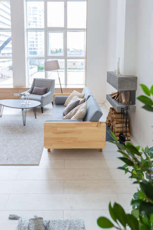 Stylish scandinavian interior with design sofa, wooden table and fireplace. Bright and sunny room with plants and brown wooden floor.