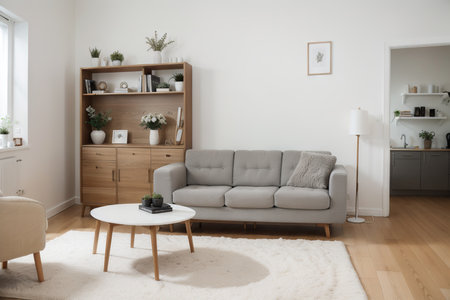 interior of modern bright living room with white walls, wooden floor and comfortable sofa