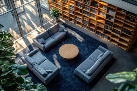 Aerial view of an office lounge with two gray sofas and a coffee table, a dark blue carpet on the floor, modern architecture, wooden bookshelves in the background, and natural light. High-resolution photography. --ar 3:2 --v 6.1 Job ID: d968a82f-80f7-473e-be7d-3565a1c0ab63