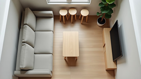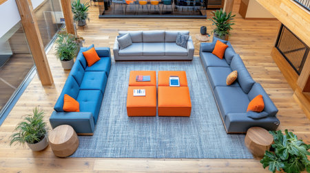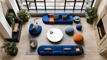An overhead view reveals a contemporary living room design. The scene features multiple blue sofas and scattered cushions, complemented by neutral-toned flooring and a rug. Potted plants add greenery. The composition, utilizing overhead lighting, would be ideal for commercial design projects or editorial content related to home decor.
