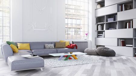 Modern spacious lounge or living room interior with tall bright windows, sofa and bookcase 3D illustration