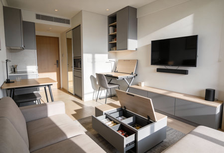 Compact versatile living room with sofa bed foldable table stackable stools neutral tones