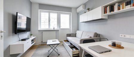 Luxury fashionable modern design studio apartment with a free layout in a minimal style. very bright huge spacious room with white walls and wooden elements.