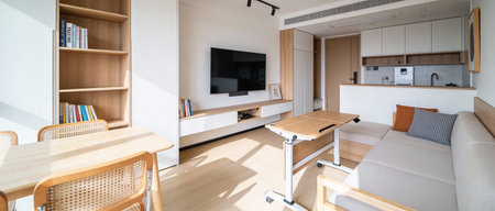 Panorama of modern apartment with living room and open kitchen