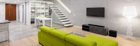 Home interior with green couch, tv and design stairs, panorama