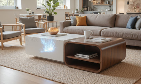 Interactive smart coffee table in Mocha Musse shades, seamlessly blending into the environment, equipped with an embedded holographic display for