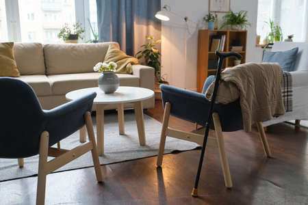 Image of modern living room with two armchairs and crutch for senior person