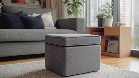 Square storage ottoman bag with a lid, doubling as a seat in a contemporary living room