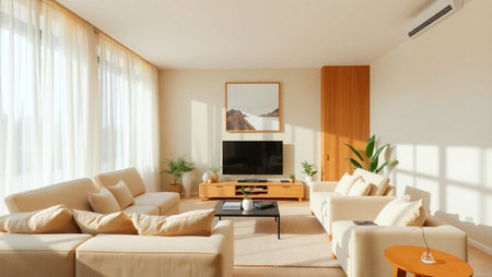 Modern living room interior design featuring elegant furniture and natural light in a spacious setting
