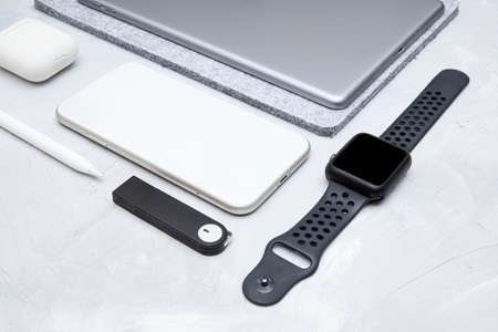 Modern everyday carry gadgets on a concrete desk: smartphone, smartwatch, digital tablet, stylus pencil, wireless earphones, memory stick. Black and white tones, copy space.