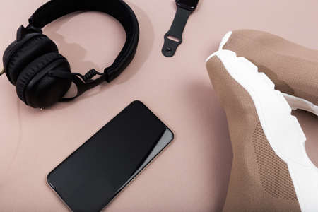 modern beige sneakers with phone, smart watch and earplugs on beige background