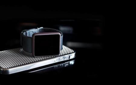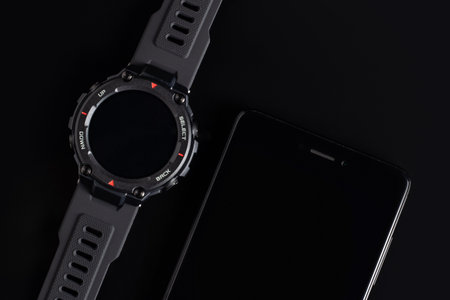 Mockup of smartwatch, smart phone, headphones, smartwatch, mobile phone on black background