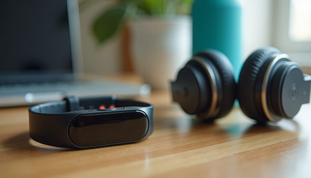 A fitness bracelet is on the table next to headphones and a bottle of water. The concept of sports detox and healthy lifestyle using technology.