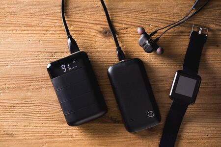 Modern power bank, smartwatch, earphones and mobile phone on gray background