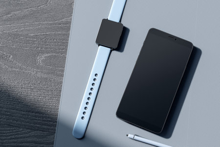 Top view of empty mobile phone screen, digital watch, pen and glasses on gray wooden tablet. Devices at workplace concept. Mock up, 3D Rendering