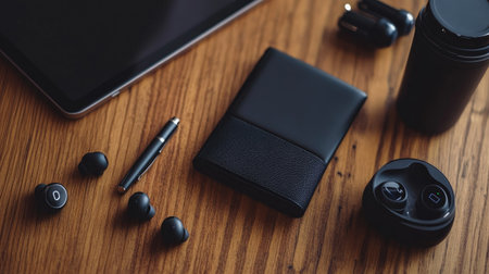 A stylish modern workspace featuring tech gadgets and accessories, including a tablet, wireless earbuds, wallet, pen, and coffee cup on a wooden table.