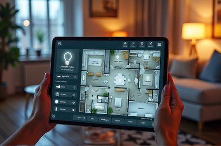 Smart home control on tablet displaying interactive floor plan in cozy living room. That the image is generated using AI.