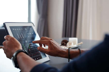 Hands of man using smart home application on tablet computer to control music volume in apartment