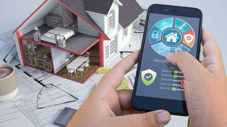 3D rendering of a modern villa controlled by a smartphone from the outside