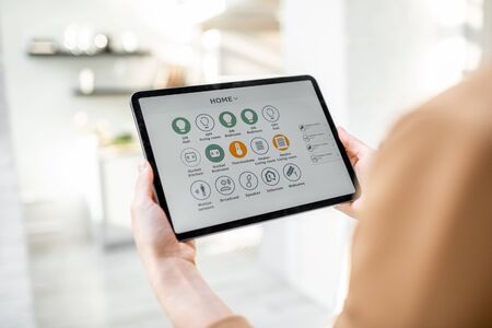 Smart home control app concept on tablet in woman hands. Home interior in background