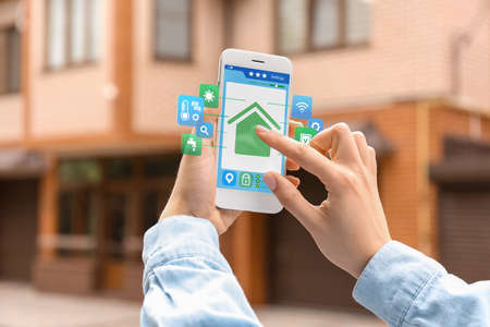 Woman controlling app with smartphone, close up on mobile device with launched smart home