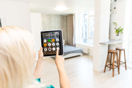 Woman use application for smart home control on tablet. Interior of living room in the background.
