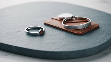 A minimalist silver ring with an orange stone and a modern smartwatch on a brown leather card rest on a dark grey slate surface.
