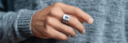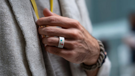 A colorful smart ring on a hand showcasing its minimalist design with a focus on the embedded sensors monitoring biometric data against a casual setting