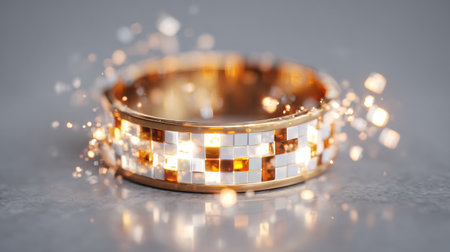 A gold band ring with alternating white and gold mosaic tiles is displayed close up on a gray surface while shimmering with bokeh light flares.
