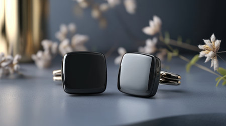 This image features elegant black and gray cufflinks artistically arranged on a soft background, complemented by delicate floral elements, exuding sophistication and style.
