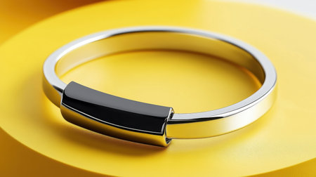 A sleek minimalist bracelet featuring a glossy black accent, set against a bright yellow background, perfect for fashion retail and jewelry displays.