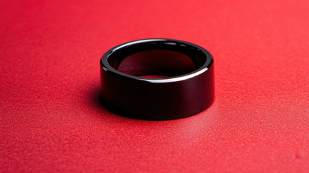 A sleek black band rests elegantly on a vivid red background, highlighting modern design elements and vibrant color contrast. Perfect for contemporary jewelry themes.
