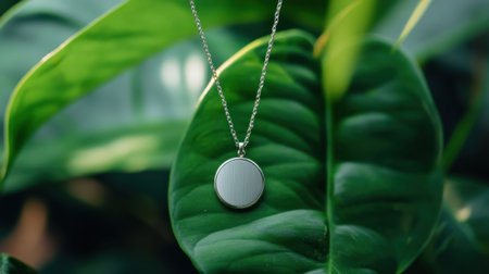 A stunning silver pendant showcasing a round design rests elegantly on a lush green leaf, creating a beautiful contrast and inviting nature's charm.
